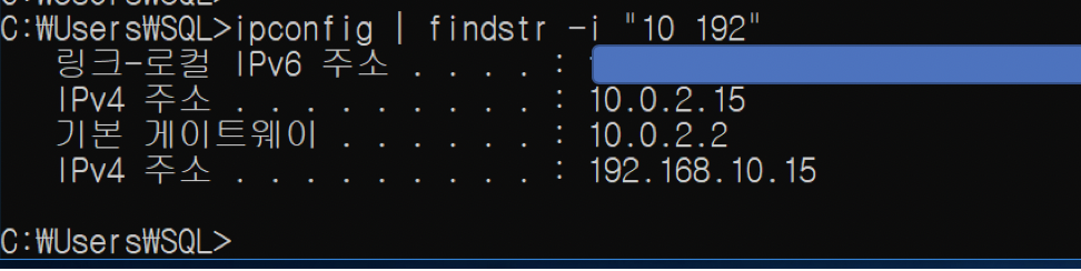 예제2) ipconfig 내용에서 10 혹은 192 문자열을 포함하는 라인들을 모두 출력하는 예제 ( or 조건 )