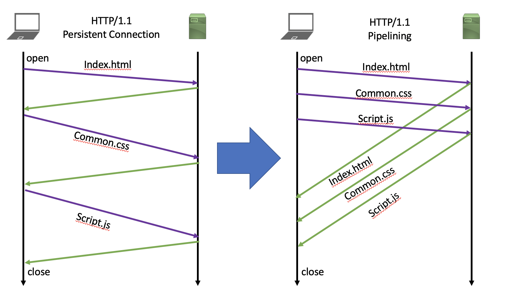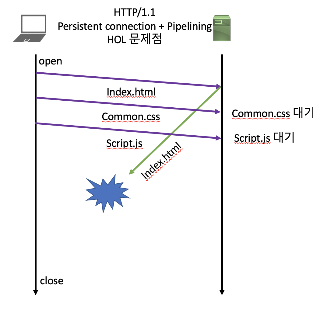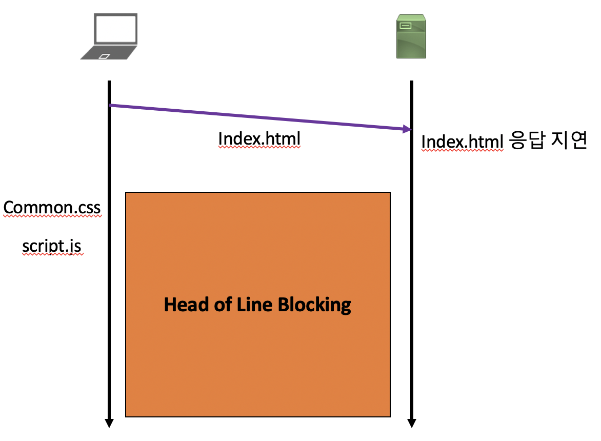 - 또한, index.html이 모두 처리되지 않는다면, 그 다음 리소스들인 common,script 리소스들은 처리되지 못한다. 이게 바로 HTTP의 고질적인 문제였던 HOL(Head of Line Blocking)이다. 이 문제는 HTTP/1.0뿐만 아니라 HTTP/1.1도 해당된다.