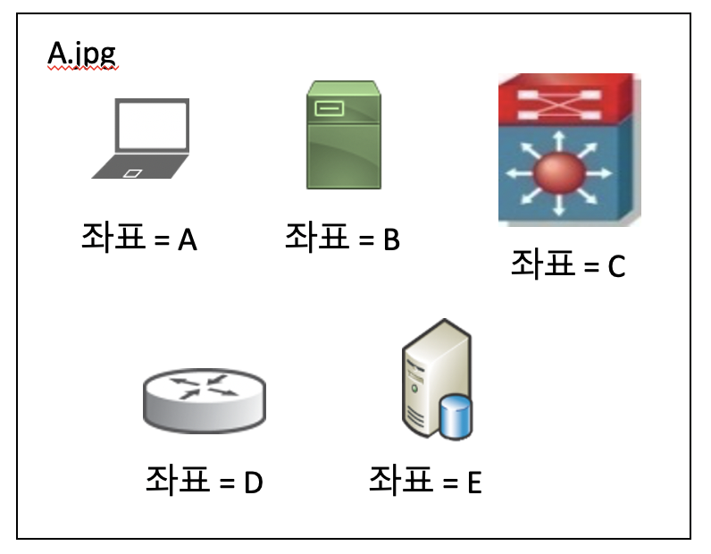 - 아래를 예로 들자면, A.jpg라는 리소스에 5개의 이미지를 넣어두었다. 1개의 도메인 커넥션을 A.jpg로 연결 한다. 만약, 서버의 html에 설정이 A좌표로 설정되어 있다면, A의 이미지를 Client에게 주게 된다.
